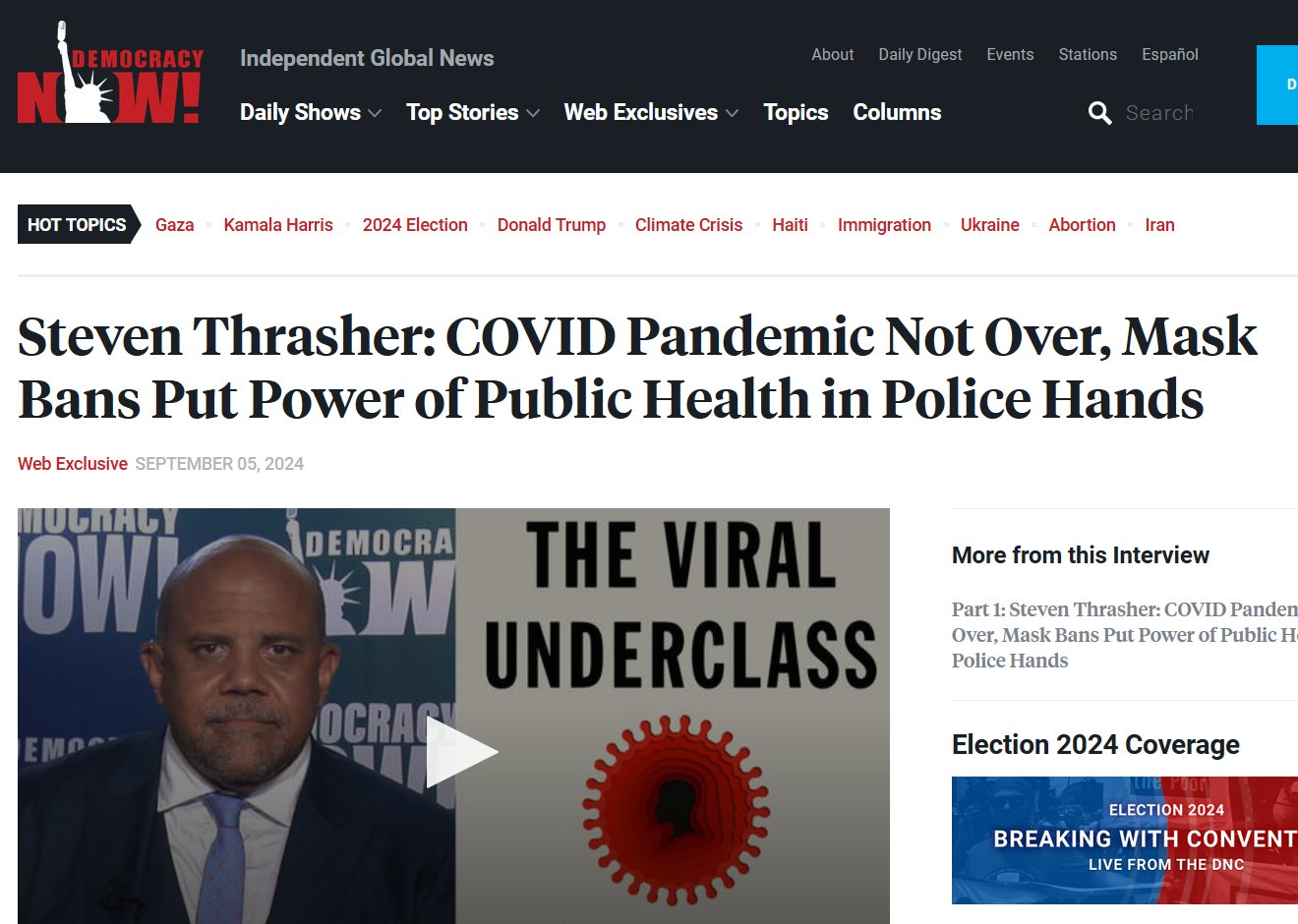 EN INGLÉS Steven Thrasher: La pandemia de COVID no ha terminado Habla sobre la actual pandemia de COVID -19 y las prohibiciones de mascarillas que están aprobando los gobiernos locales y en los campus universitarios. “Esta es una situación realmente muy peligrosa”, dice Thrasher