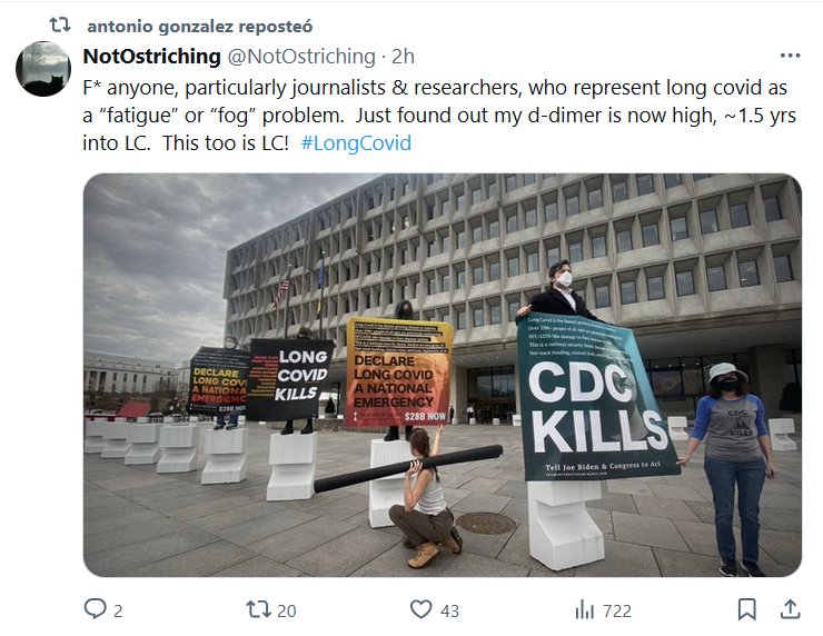 TESTIMONIOS (EN INGLÉS) Que se joda cualquiera, en particular periodistas e investigadores, que representan el covid prolongado como un problema de “fatiga” o “niebla”. Acabo de descubrir que mi d-dimer ahora está alto, después de 1,5 años de LC. ¡Esto también es LC! #CovidProlongado