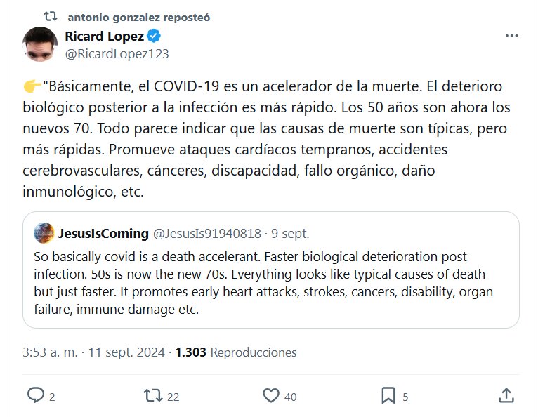 👉»Básicamente, el COVID-19 es un acelerador de la muerte. El deterioro biológico posterior a la infección es más rápido. Los 50 años son ahora los nuevos 70. Todo parece indicar que las causas de muerte son típicas, pero más rápidas. Promueve ataques cardíacos tempranos