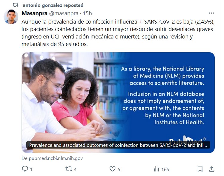 Aunque la prevalencia de coinfección influenza + SARS-CoV-2 es baja (2,45%), los pacientes coinfectados tienen un mayor riesgo de sufrir desenlaces graves (ingreso en UCI, ventilación mecánica o muerte), según una revisión y metanálisis de 95 estudios