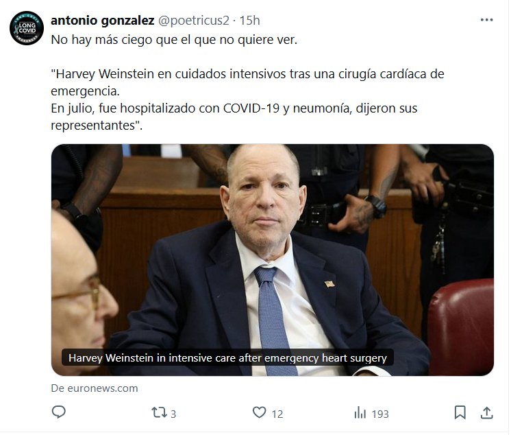 No hay más ciego que el que no quiere ver. «Harvey Weinstein en cuidados intensivos tras una cirugía cardíaca de emergencia. En julio, fue hospitalizado con COVID-19 y neumonía, dijeron sus representantes»