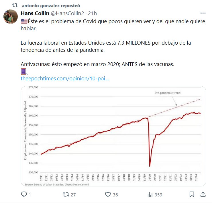 🇺🇲Éste es el problema de Covid que pocos quieren ver y del que nadie quiere hablar. La fuerza laboral en Estados Unidos está 7.3 MILLONES por debajo de la tendencia de antes de la pandemia. Posted on septiembre 13, 2024 por coronado