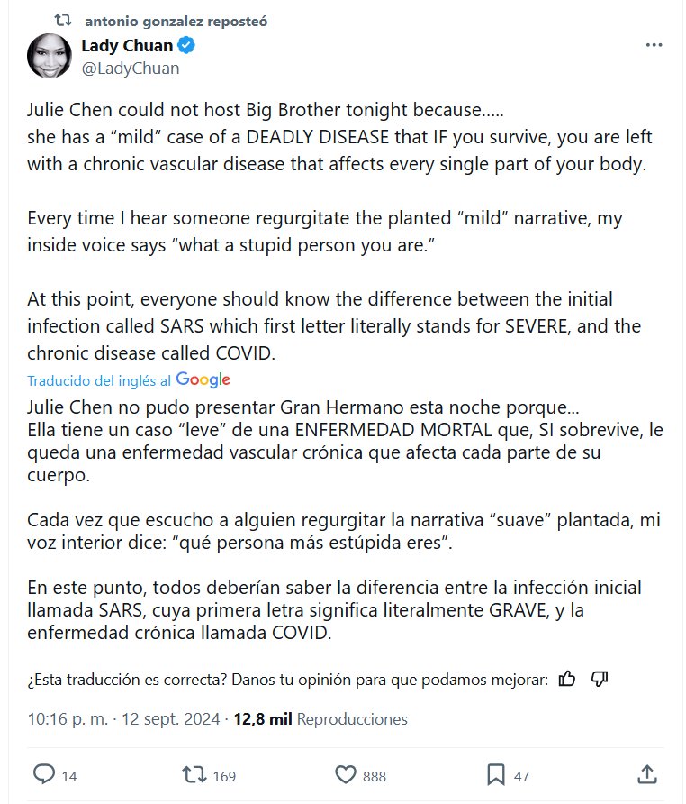 EN INGLÉS Julie Chen no pudo presentar Gran Hermano esta noche porque… Ella tiene un caso “leve” de una ENFERMEDAD MORTAL que, SI sobrevive, le queda una enfermedad vascular crónica que afecta cada parte de su cuerpo. Cada vez que escucho a alguien regurgitar la narrativa “suave” plantada, mi voz interior dice: “qué persona más estúpida eres”. En este punto, todos deberían saber la diferencia entre la infección inicial llamada SARS, cuya primera letra significa literalmente GRAVE, y la enfermedad crónica llamada COVID