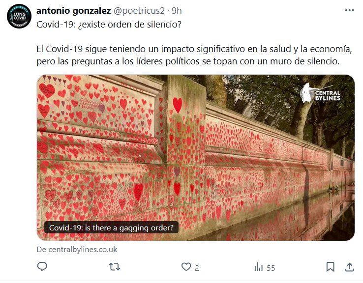El Covid-19 tiene dos muros: el muro conmemorativo de los fallecidos por el virus SARS-CoV-2 y el «muro del silencio» cuando se hacen preguntas. Aunque el #Covid-19 es tendencia en las redes sociales con regularidad en publicaciones de personas «conscientes del Covid» (investigadores en el campo, médicos que ven el impacto, legos con conocimientos científicos o personas clínicamente vulnerables o que han sido perjudicadas por la infección), desde hace algún tiempo se ha criticado que los líderes políticos y los periodistas convencionales están inexplicablemente evasivamente.