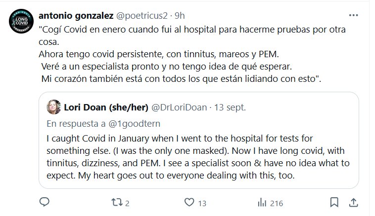 TESTIMONIOS «Cogí Covid en enero cuando fui al hospital para hacerme pruebas por otra cosa. Ahora tengo covid persistente, con tinnitus, mareos y PEM. Veré a un especialista pronto y no tengo idea de qué esperar. Mi corazón también está con todos los que están lidiando con esto»