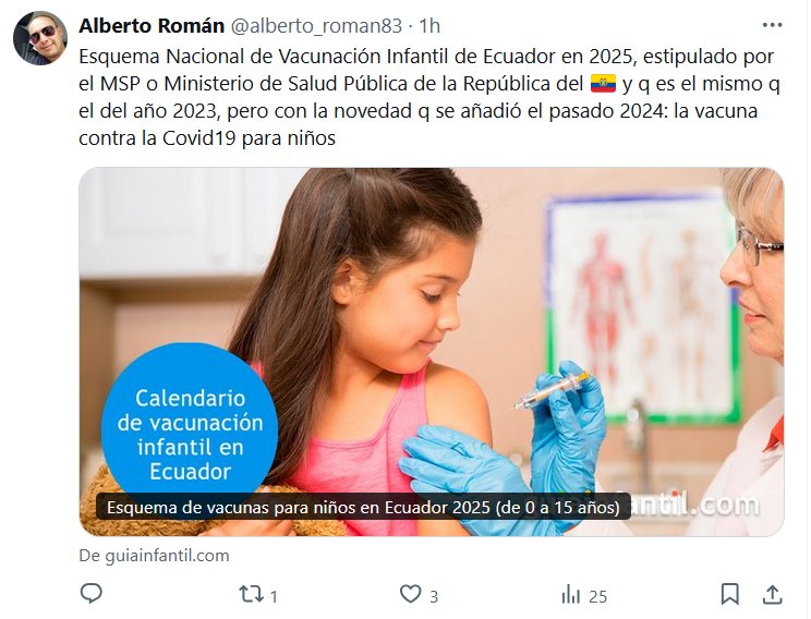 BRAVO! Esquema Nacional de Vacunación Infantil de Ecuador en 2025, estipulado por el MSP o Ministerio de Salud Pública de la República del 🇪🇨 y q es el mismo q el del año 2023, pero con la novedad q se añadió el pasado 2024: la vacuna contra la Covid19 para niños