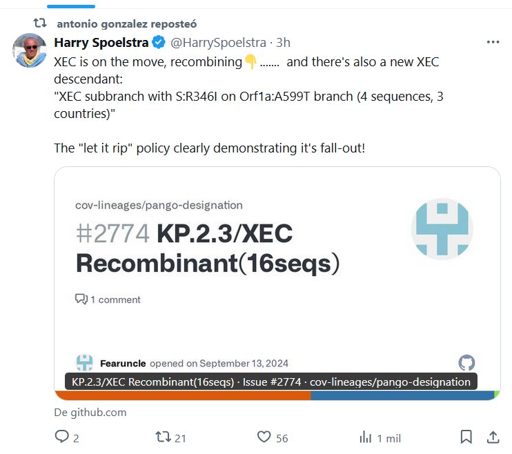 EN INGLÉS Harry Spoelstra @HarrySpoelstra XEC está en movimiento, recombinándose👇……. y también hay un nuevo descendiente de XEC: «Subrama XEC con S:R346I en la rama Orf1a:A599T (4 secuencias, 3 países)» ¡La política de «dejar que explote» demuestra claramente sus consecuencias!
