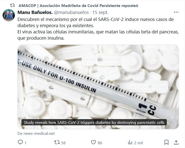 Descubren el mecanismo por el cual el SARS-CoV-2 induce nuevos casos de diabetes y empeora los ya existentes. El virus activa las células inmunitarias, que matan las células beta del pancreas, que producen insulina.