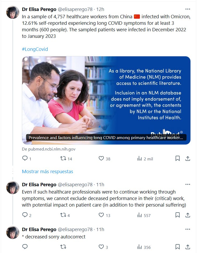 Dra. Elisa Perego @elisaperego78 En una muestra de 4.757 trabajadores sanitarios de China 🇨🇳 infectados con Omicron, el 12,61 % informó haber experimentado síntomas prolongados de COVID durante al menos 3 meses (600 personas). Los pacientes muestreados se infectaron entre diciembre de 2022 y enero de 2023 #LongCovid