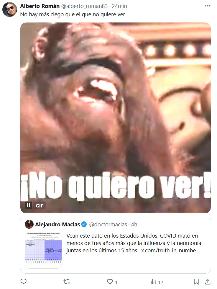 No hay más ciego que el que no quiere ver . Vean este dato en los Estados Unidos. COVID mató en menos de tres años más que la influenza y la neumonía juntas en los últimos 15 años Posted on septiembre 17, 2024 por coronado https://x.com/doctormacias/status/1835966296225161470