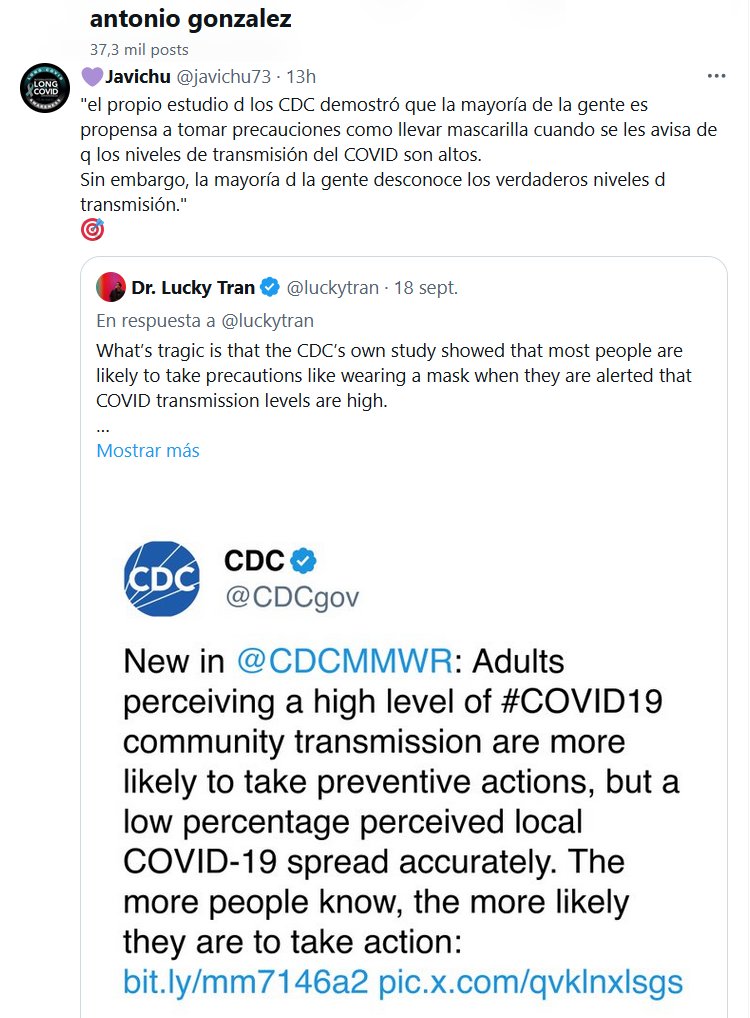 DESINFORMAR ES UN CRIMEN «el propio estudio d los CDC demostró que la mayoría de la gente es propensa a tomar precauciones como llevar mascarilla cuando se les avisa de q los niveles de transmisión del COVID son altos. Sin embargo, la mayoría d la gente desconoce los verdaderos niveles d transmisión.» 🎯