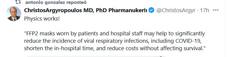 EN INGLÉS ChristosArgyropoulos MD, PhD PharmanukerInChief @ChristosArgyrop ¡La física funciona! «Las mascarillas FFP2 que usan los pacientes y el personal hospitalario pueden ayudar a reducir significativamente la incidencia de infecciones respiratorias virales, incluida la COVID-19, acortar el tiempo de hospitalización y reducir los costos sin afectar la supervivencia»