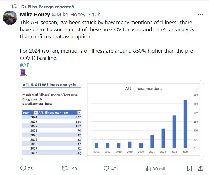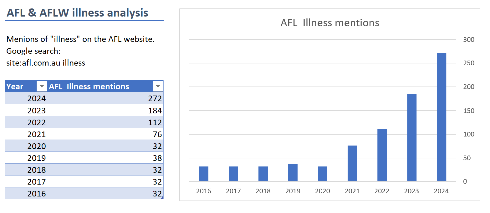 EN INGLÉS En esta temporada de la AFL, me ha sorprendido la cantidad de menciones de «enfermedad» que ha habido. Supongo que la mayoría de estos son casos de COVID, y aquí hay un análisis que confirma esa suposición. Para 2024 (hasta ahora), las menciones de enfermedad son alrededor de un 850% más altas que la línea de base anterior a COVID