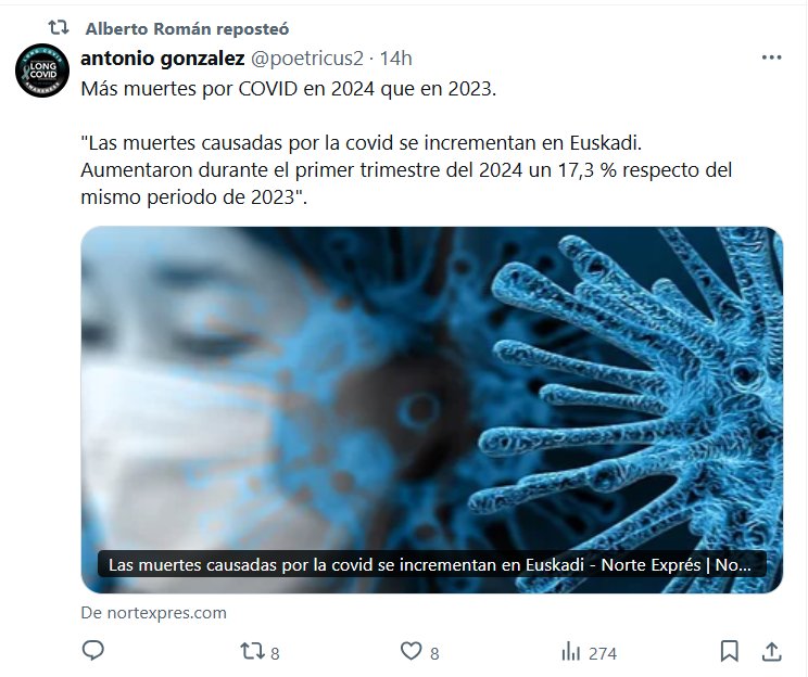 «FIN DE PANDEMIA»? Más muertes por COVID en 2024 que en 2023. «Las muertes causadas por la covid se incrementan en Euskadi. Aumentaron durante el primer trimestre del 2024 un 17,3 % respecto del mismo periodo de 2023»
