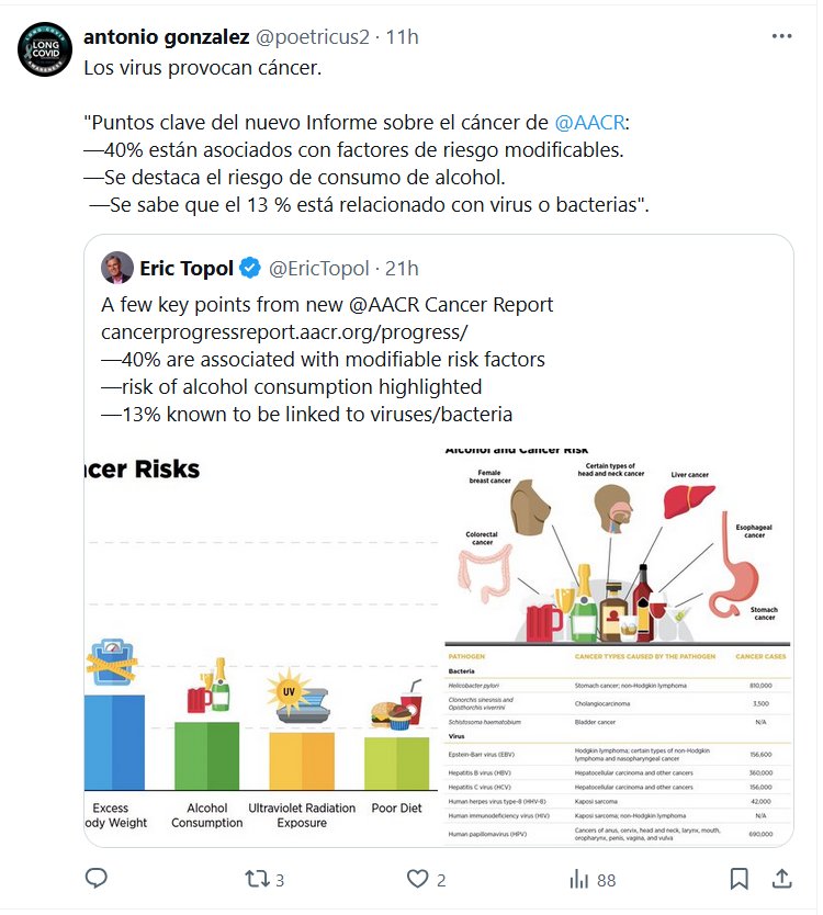 SÍ, EL SARSCOV2 QUE PRODUCE LA COVID, TAMBIÉN! Los virus provocan cáncer. «Puntos clave del nuevo Informe sobre el cáncer de @AACR : —40% están asociados con factores de riesgo modificables. —Se destaca el riesgo de consumo de alcohol. —Se sabe que el 13 % está relacionado con virus o bacterias»