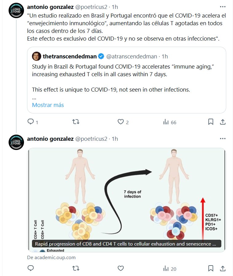 COVID≠GRIPE -> COVID≈SIDA «Un estudio realizado en Brasil y Portugal encontró que el COVID-19 acelera el “envejecimiento inmunológico”, aumentando las células T agotadas en todos los casos dentro de los 7 días. Este efecto es exclusivo del COVID-19 y no se observa en otras infecciones»