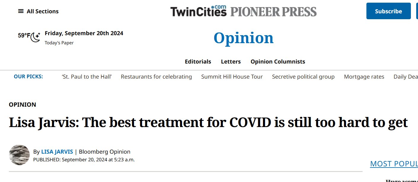 EN INGLÉS Lisa Jarvis: El mejor tratamiento para el COVID todavía es muy difícil de conseguir Posted on septiembre 20, 2024 por coronado https://www.twincities.com/2024/09/20/lisa-jarvis-the-best-treatment-for-covid-is-still-too-hard-to-get/