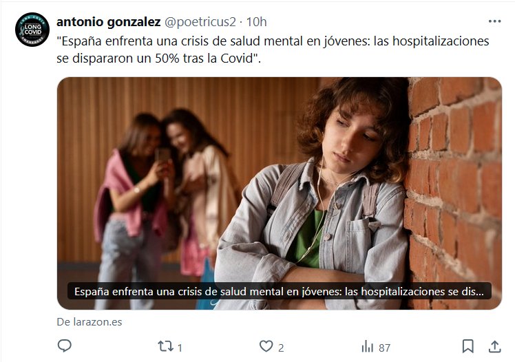 «España enfrenta una crisis de salud mental en jóvenes: las hospitalizaciones se dispararon un 50% tras la Covid» Posted on septiembre 20, 2024 por coronado