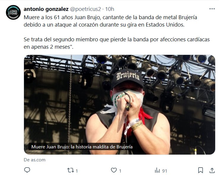 POSTCOVID HACE ESTRAGOS Muere a los 61 años Juan Brujo, cantante de la banda de metal Brujería debido a un ataque al corazón durante su gira en Estados Unidos. Se trata del segundo miembro que pierde la banda por afecciones cardíacas en apenas 2 meses»