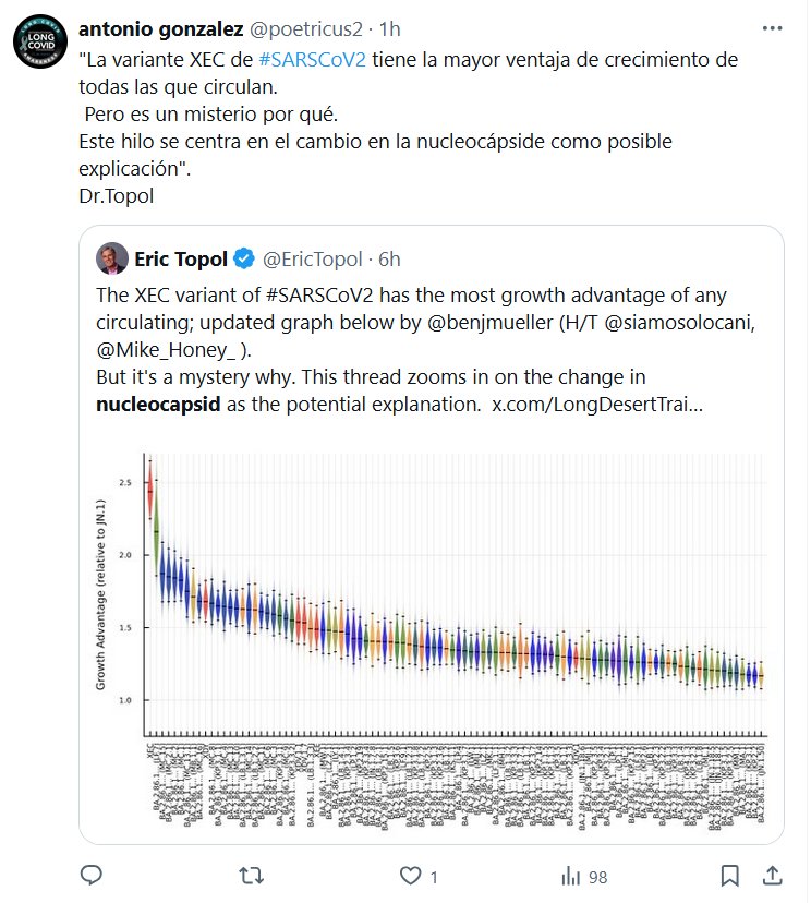 «La variante XEC de #SARSCoV2 tiene la mayor ventaja de crecimiento de todas las que circulan. Pero es un misterio por qué. Este hilo se centra en el cambio en la nucleocápside como posible explicación». Dr.Topol
