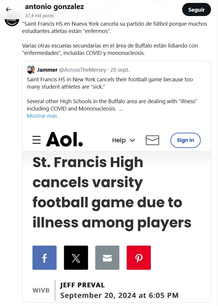 COVID Y POSTCOVID HACEN ESTRAGOS «Saint Francis HS en Nueva York cancela su partido de fútbol porque muchos estudiantes atletas están «enfermos». Varias otras escuelas secundarias en el área de Buffalo están lidiando con “enfermedades”, incluidas COVID y mononucleosis