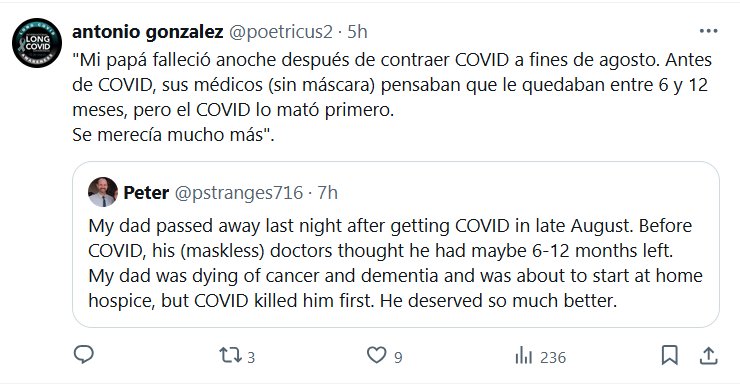 TESTIMONIOS «Mi papá falleció anoche después de contraer COVID a fines de agosto. Antes de COVID, sus médicos (sin máscara) pensaban que le quedaban entre 6 y 12 meses, pero el COVID lo mató primero. Se merecía mucho más»