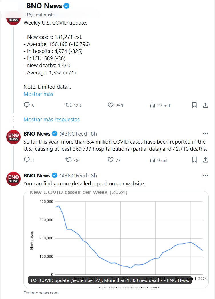 EN INGLÉS Actualización semanal sobre la COVID-19 en EE. UU.: – Nuevos casos: 131 271 aproximadamente – Promedio: 156 190 (-10 796) – En el hospital: 4974 (-325) – En la UCI: 589 (-36) – Nuevas muertes: 1360 – Promedio: 1352 (+71) Nota: Datos limitados