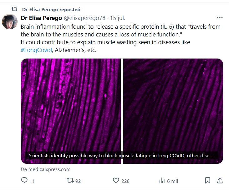 EN INGLÉS Dra. Elisa Perego @elisaperego78 Se ha descubierto que la inflamación cerebral libera una proteína específica (IL-6) que «viaja desde el cerebro a los músculos y provoca una pérdida de la función muscular». Podría contribuir a explicar el desgaste muscular que se observa en enfermedades como el #CovidProlongado, el Alzheimer, etc.