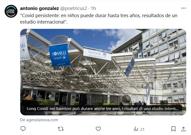 «Covid persistente: en niños puede durar hasta tres años, resultados de un estudio internacional». Posted on septiembre 24, 2024 por coronado EN ITALIANO: https://www.agenzianova.com/news/long-covid-nei-bambini-puo-durare-anche-tre-anni-i-risultati-di-uno-studio-internazionale/