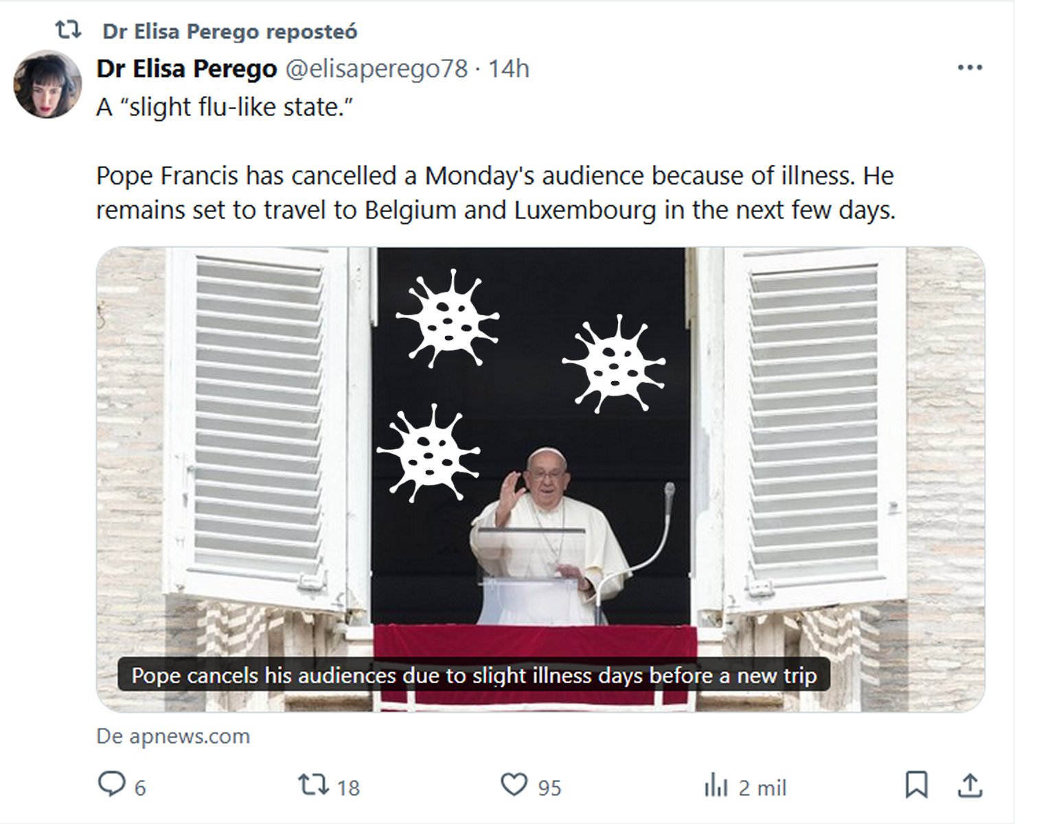 NO ERA EL DIABLO EL PAPA DE LA MENTIRA? EN INGLÉS Dra. Elisa Perego @elisaperego78 Un “ligero estado gripal”. El papa Francisco ha cancelado la audiencia del lunes por estar enfermo. En los próximos días tiene previsto viajar a Bélgica y Luxemburgo.