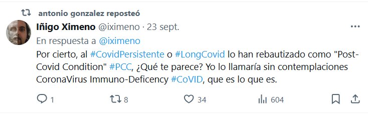 Por cierto, al #CovidPersistente o #LongCovid lo han rebautizado como «Post-Covid Condition» #PCC, ¿Qué te parece? Yo lo llamaría sin contemplaciones CoronaVirus Immuno-Deficency #CoVID, que es lo que es.
