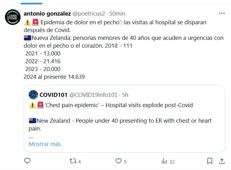⚠️🚨‘Epidemia de dolor en el pecho’: las visitas al hospital se disparan después de Covid. 🇳🇿Nueva Zelanda: personas menores de 40 años que acuden a urgencias con dolor en el pecho o el corazón. 2018 – 111 2021 – 13.000 2022 – 21.416 2023 – 20.000 2024 al presente 14.639