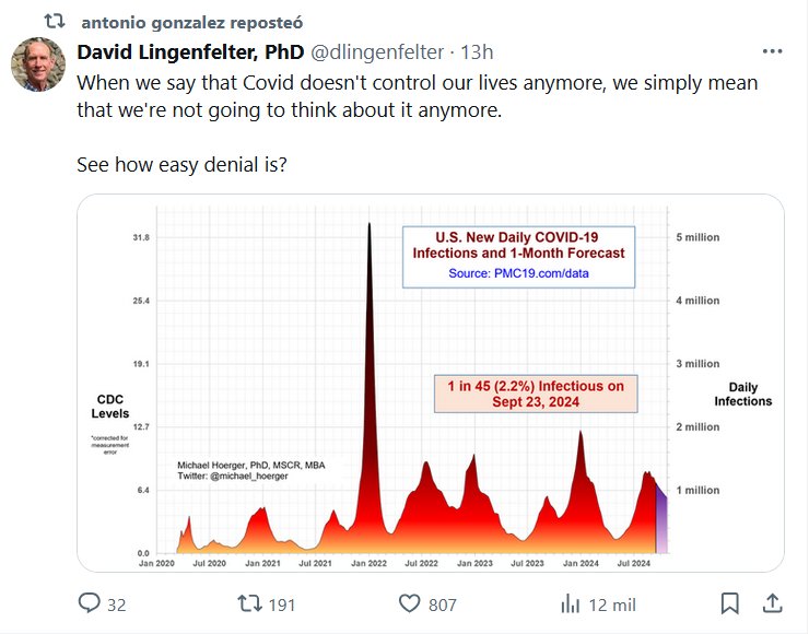 EN INGLÉS DR. David Lingenfelter, PhD @dlingenfelter Cuando decimos que el Covid ya no controla nuestras vidas, simplemente queremos decir que no vamos a pensar más en ello. ¿Ves lo fácil que es negarlo?