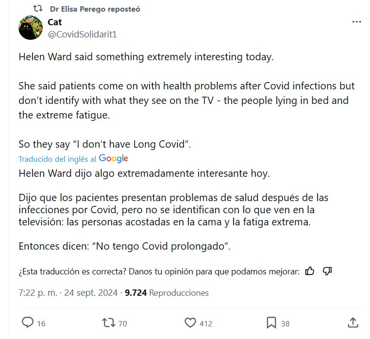 EN INGLÉS Helen Ward dijo algo extremadamente interesante hoy. Dijo que los pacientes presentan problemas de salud después de las infecciones por Covid, pero no se identifican con lo que ven en la televisión: las personas acostadas en la cama y la fatiga extrema. Entonces dicen: “No tengo Covid prolongado”