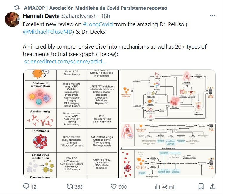 EN INGLÉS Excelente nueva reseña sobre #LongCovid del increíble Dr. Peluso (@MichaelPelusoMD ) y el Dr. Deeks. Una inmersión increíblemente completa en los mecanismos, así como en más de 20 tipos de tratamientos para probar (ver el gráfico a continuación)