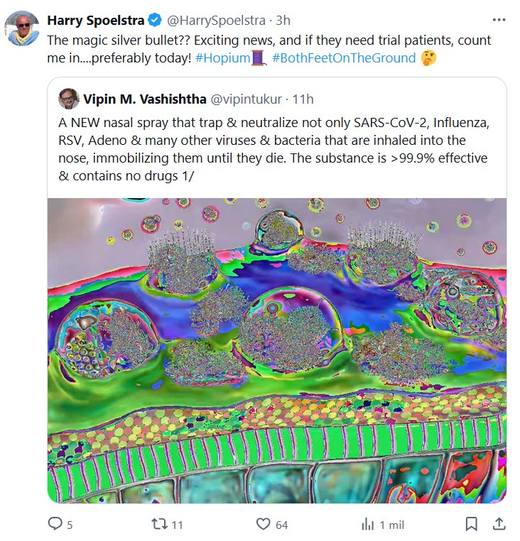 EN INGLÉS ¿La bala de plata mágica? Es una noticia emocionante y, si necesitan pacientes de prueba, cuenten conmigo… ¡preferiblemente hoy! Un NUEVO aerosol nasal que atrapa y neutraliza no solo el SARS-CoV-2, la influenza, el VSR, el adenovirus y muchos otros virus y bacterias que se inhalan por la nariz, inmovilizándolos hasta que mueren. La sustancia tiene una eficacia superior al 99,9 % y no contiene medicamentos
