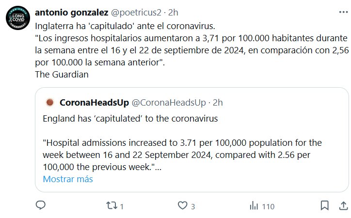 Inglaterra ha ‘capitulado’ ante el coronavirus. «Los ingresos hospitalarios aumentaron a 3,71 por 100.000 habitantes durante la semana entre el 16 y el 22 de septiembre de 2024, en comparación con 2,56 por 100.000 la semana anterior». The Guardian