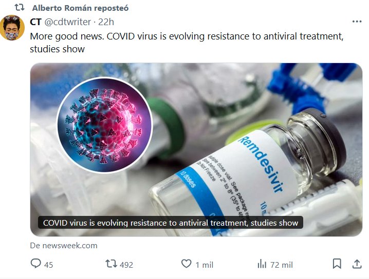 EN INGLÉS Más buenas noticias [SARCASMO]. El virus de la COVID-19 está desarrollando resistencia al tratamiento antiviral, según muestran los estudios Posted on septiembre 27, 2024 por coronado https://www.newsweek.com/covid-virus-evolving-resistance-antiviral-treatment-remdesivir-1959696