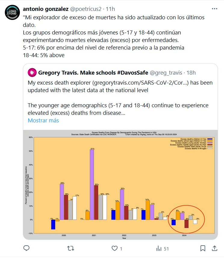 Mi explorador de exceso de muertes ha sido actualizado con los últimos dato. Los grupos demográficos más jóvenes (5-17 y 18-44) continúan experimentando muertes elevadas (exceso) por enfermedades. 5-17: 6% por encima del nivel de referencia previo a la pandemia 18-44: 5% por encima