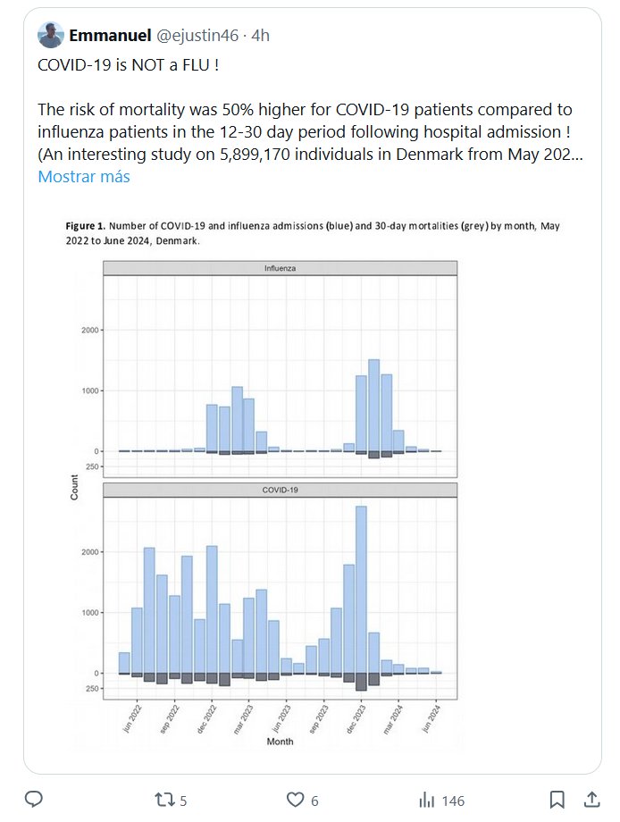¡COVID NO es una GRIPE! ¡El riesgo de mortalidad fue un 50% mayor para los pacientes con COVID en comparación con los pacientes con gripe de 12 a 30 días después del ingreso hospitalario! Estudio sobre 5.899.170 personas en Dinamarca desde mayo de 2022 hasta junio de 2024