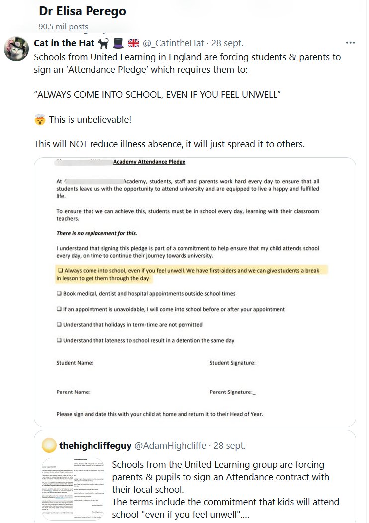 COVIDIOCIA (EN INGLÉS) Las escuelas de United Learning en Inglaterra están obligando a los estudiantes y a los padres a firmar un «Compromiso de asistencia» que les exige: “VEN SIEMPRE A LA ESCUELA, AUNQUE TE SIENTAS MAL” 🤯 Esto es increíble! Esto NO reducirá el ausentismo por enfermedad, sólo lo propagará a otros.