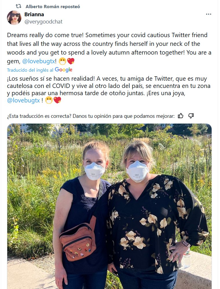 SI SE QUIERE SE PUEDE (EN INGLÉS) ¡Los sueños sí se hacen realidad! A veces, tu amiga de Twitter, que es muy cautelosa con el COVID y vive al otro lado del país, se encuentra en tu zona y podéis pasar una hermosa tarde de otoño juntas. ¡Eres una joya, @lovebugtx ! 😷💖