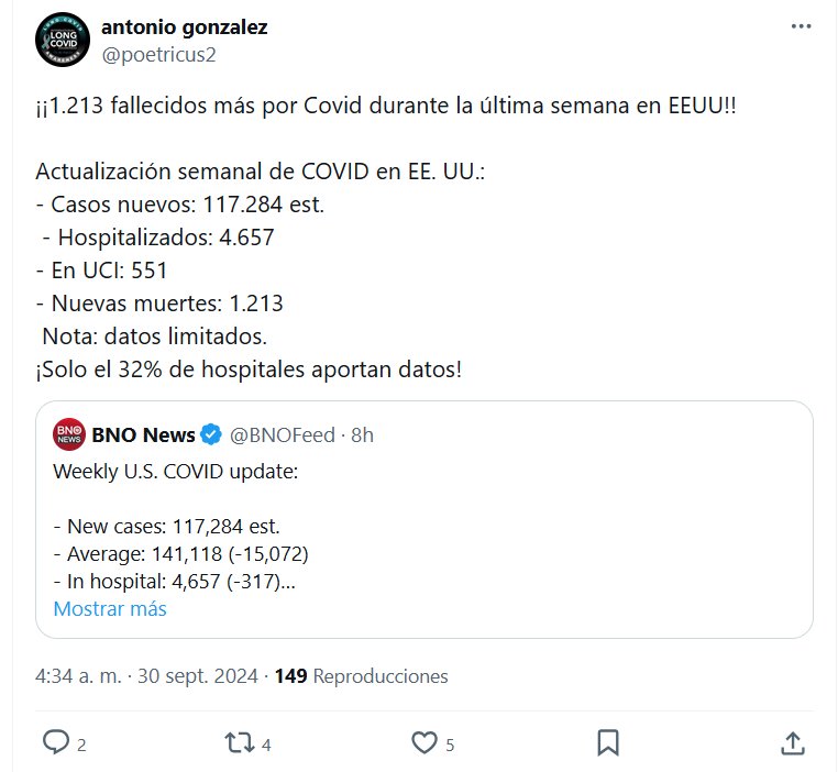 Y ESTA CIFRA NO SE SABE POR CUANTO HAY QUE MULTIPLICARLA ¡¡1.213 fallecidos más por Covid durante la última semana en EEUU!! Actualización semanal de COVID en EE. UU.: – Casos nuevos: 117.284 est. – Hospitalizados: 4.657 – En UCI: 551 – Nuevas muertes: 1.213 Nota: datos limitados. ¡Solo el 32% de hospitales aportan datos!