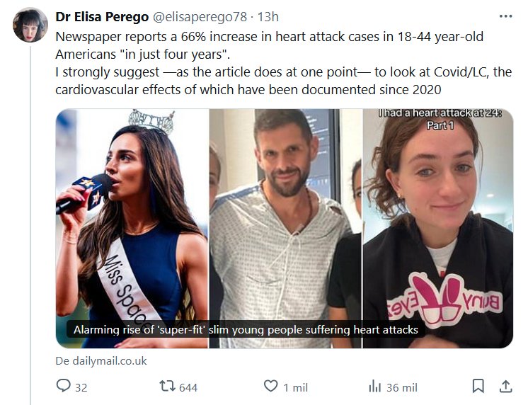 EN INGLÉS Dra. Elisa Perego @elisaperego78 Un periódico informa de un aumento del 66% de los casos de infarto en estadounidenses de entre 18 y 44 años «en tan solo cuatro años». Recomiendo encarecidamente —como hace el artículo en un momento— que se examine el Covid/LC, cuyos efectos cardiovasculares se han documentado desde 2020