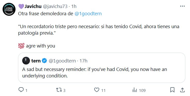 Y A LA SIGUIENTE INFECCIÓN… Otra frase demoledora de @1goodtern «Un recordatorio triste pero necesario: si has tenido Covid, ahora tienes una patología previa.» Posted on octubre 4, 2024 por coronado