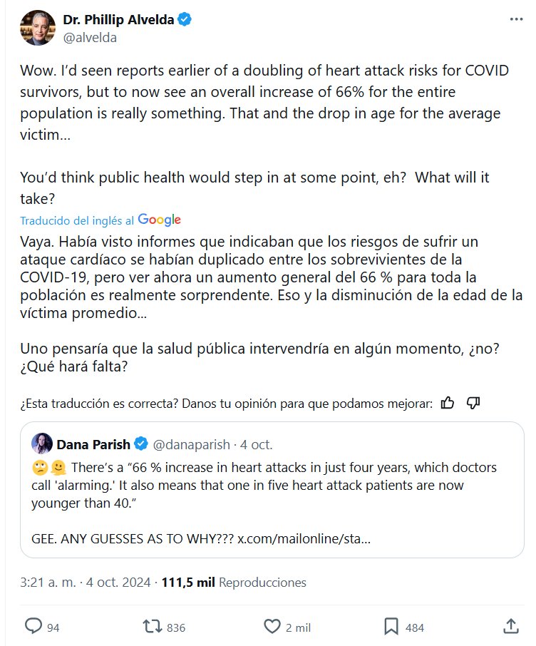 Dr. Phillip Alvelda @alvelda «Vaya. Había visto informes que indicaban que los riesgos de sufrir un ataque cardíaco se habían duplicado entre los sobrevivientes de la COVID-19, pero ver ahora un aumento general del 66 % para toda la población es realmente sorprendente. Eso y la disminución de la edad de la víctima promedio… Uno pensaría que la salud pública intervendría en algún momento, ¿no? ¿Qué hará falta?»