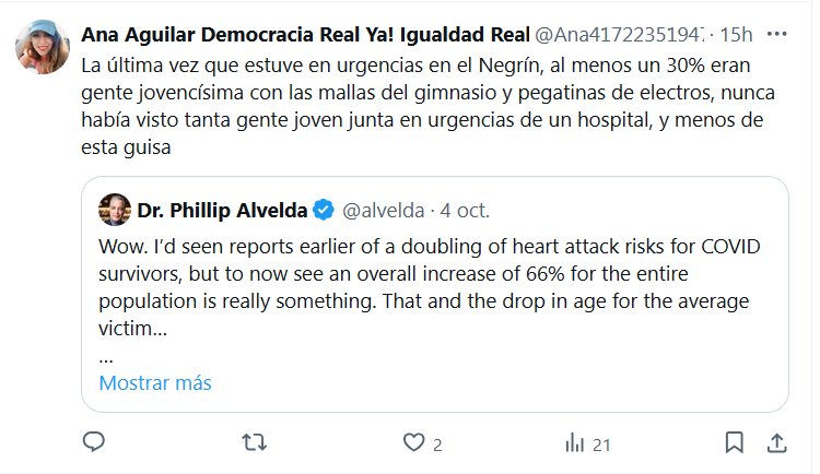 TESTIMONIOS Ana Aguilar Democracia Real Ya! Igualdad Real Ya! @Ana417223519476 · La última vez que estuve en urgencias en el Negrín, al menos un 30% eran gente jovencísima con las mallas del gimnasio y pegatinas de electros, nunca había visto tanta gente joven junta en urgencias de un hospital, y menos de esta guisa Cita AL Dr. Phillip Alvelda @alvelda «Vaya. Había visto informes que indicaban que el riesgo de sufrir un ataque cardíaco se duplicaba entre los sobrevivientes de COVID-19, pero ver ahora un aumento general del 66 % para toda la población es algo realmente sorprendente»