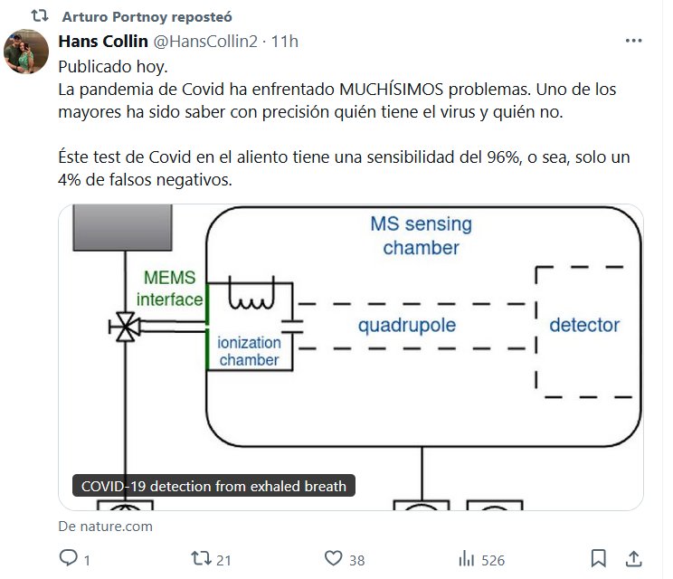 Publicado hoy. La pandemia de Covid ha enfrentado MUCHÍSIMOS problemas. Uno de los mayores ha sido saber con precisión quién tiene el virus y quién no. Éste test de Covid en el aliento tiene una sensibilidad del 96%, o sea, solo un 4% de falsos negativos.
