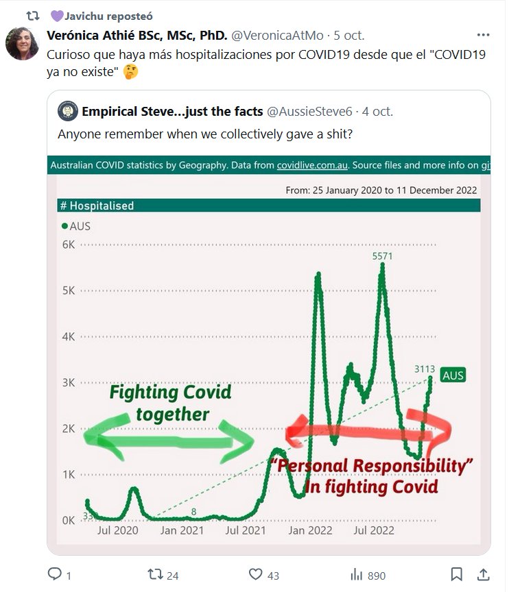 SARCASMO, IRONÍA, BURLA, SOCARRONERÍA Verónica Athié BSc, MSc, PhD. @VeronicaAtMo · 5 oct. Curioso que haya más hospitalizaciones por COVID19 desde que el «COVID19 ya no existe» 🤔 Posted on octubre 7, 2024 por coronado