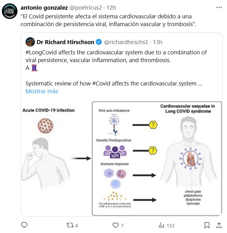 «El Covid persistente afecta el sistema cardiovascular debido a una combinación de persistencia viral, inflamación vascular y trombosis» Posted on octubre 8, 2024 por coronado
